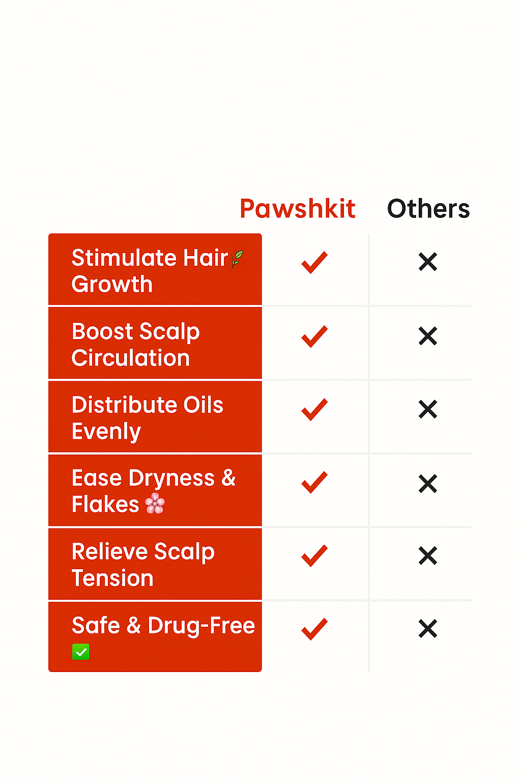 Most brushes barely touch the surface. Pawshkit™ goes further. With gentle vibration, soothing scalp massage, and advanced red light therapy, it stimulates follicles where others fail. Built for relaxation, circulation, and healthier-looking hair — Pawshkit™ stands apart.